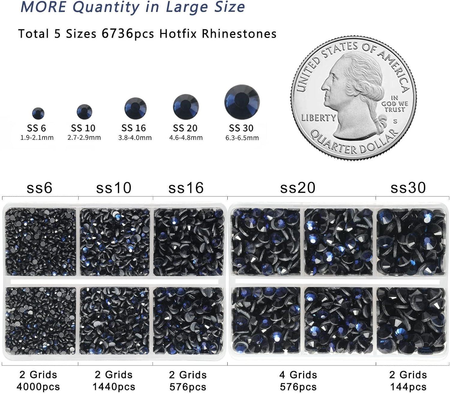More quantity of large rhinestones: SS6 rhinestones (1.9-2.1 mm) 4000 pcs, SS10 rhinestones (2.7-2.9 mm) 1440 pcs, SS16 rhinestones (3.8-4.0 mm) 576 pcs,SS20 rhinestones (4.6-4.8 mm) 576 pcs, SS30 rhinestones (6.3-6.5 mm) 144 pcs. Quantities may vary slightly. Color shades of different sizes may vary slightly