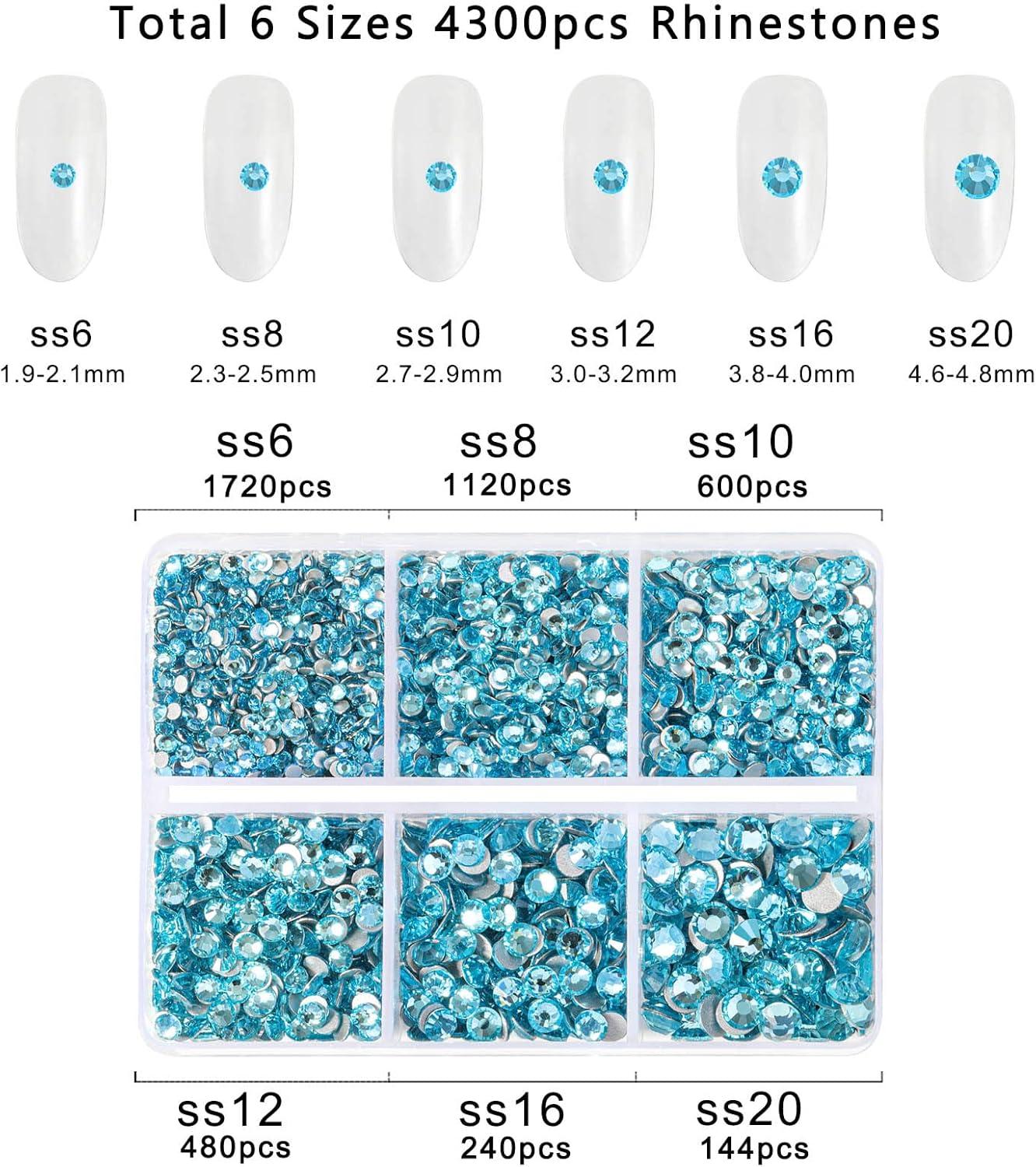 Large Quantity Nail Art Rhinestones Gems: SS6(1.9-2.1mm) 1720pcs,SS8(2.3-2.5mm) 1120pcs,SS10(2.7-2.9mm) 600pcs,SS12(3.0-3.2mm) 480pcs,SS16(3.8-4.0mm) 240pcs,SS20(4.6-4.8mm) 144pcs.Quantities may vary slightly.Color shades of different sizes may vary slightly.