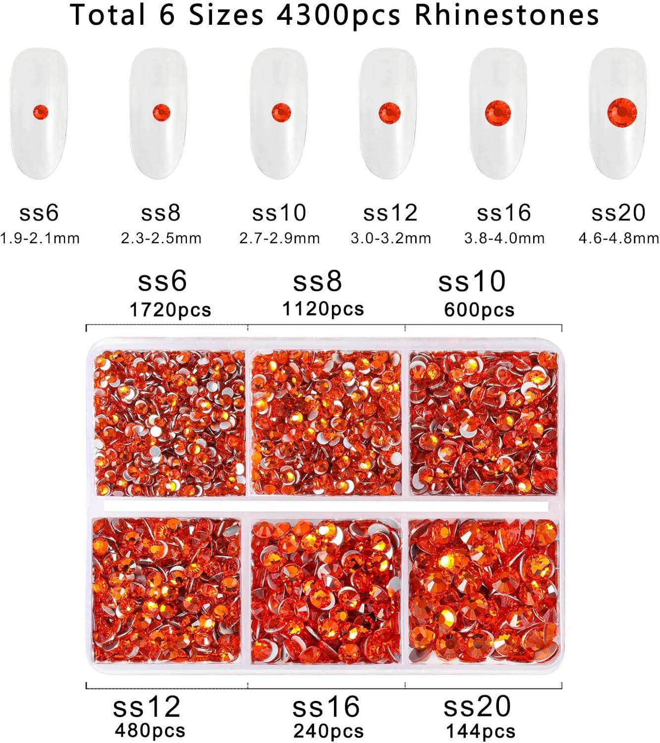 Large Quantity Nail Art Rhinestones Gems: SS6(1.9-2.1mm) 1720pcs,SS8(2.3-2.5mm) 1120pcs,SS10(2.7-2.9mm) 600pcs,SS12(3.0-3.2mm) 480pcs,SS16(3.8-4.0mm) 240pcs,SS20(4.6-4.8mm) 144pcs.Quantities may vary slightly.Color shades of different sizes may vary slightly.