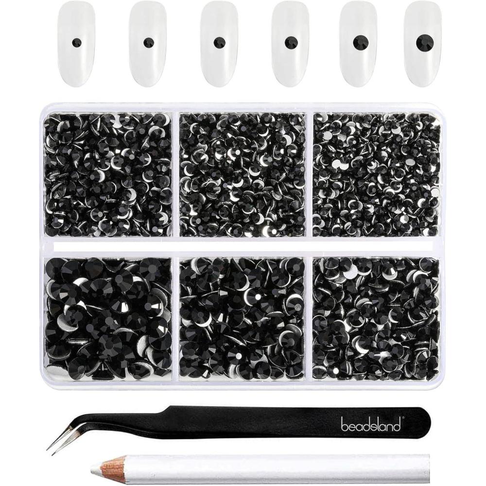 imageBeadsland 4300pcs Flatback RhinestonesGray Rhinestone Nail Gems Round Crystal Rhinestones for CraftsMixed 6 Sizes with Picking Tweezers and Wax Pencil Kit SS6SS20Black DiamondJet Black