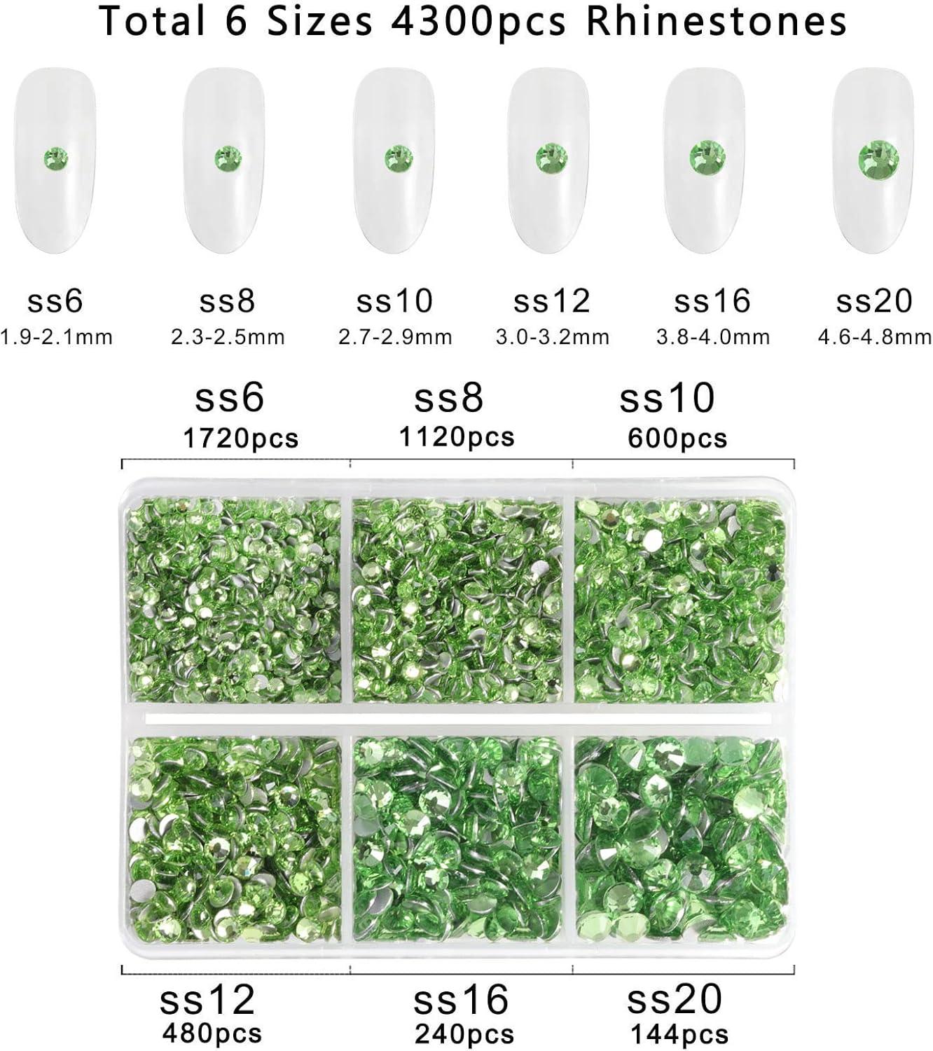 Large Quantity Nail Art Rhinestones Gems: SS6(1.9-2.1mm) 1720pcs,SS8(2.3-2.5mm) 1120pcs,SS10(2.7-2.9mm) 600pcs,SS12(3.0-3.2mm) 480pcs,SS16(3.8-4.0mm) 240pcs,SS20(4.6-4.8mm) 144pcs.Quantities may vary slightly.Color shades of different sizes may vary slightly.
