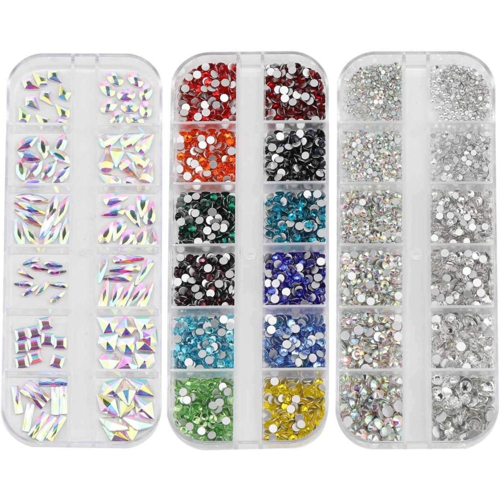 one box with 2400 rhinestones mix 12 color in size SS10(2.7-2.9mm),200 pcs each color.one box with 1440 rhinestones Clear color mix 6 sizes (SS10-SS16,1.5-4mm)and 1440 Clear AB mix 6 sizes (SS10-SS16,1.5-4mm),one box with 120 pcs AB Crystals in 10 different Shapes.