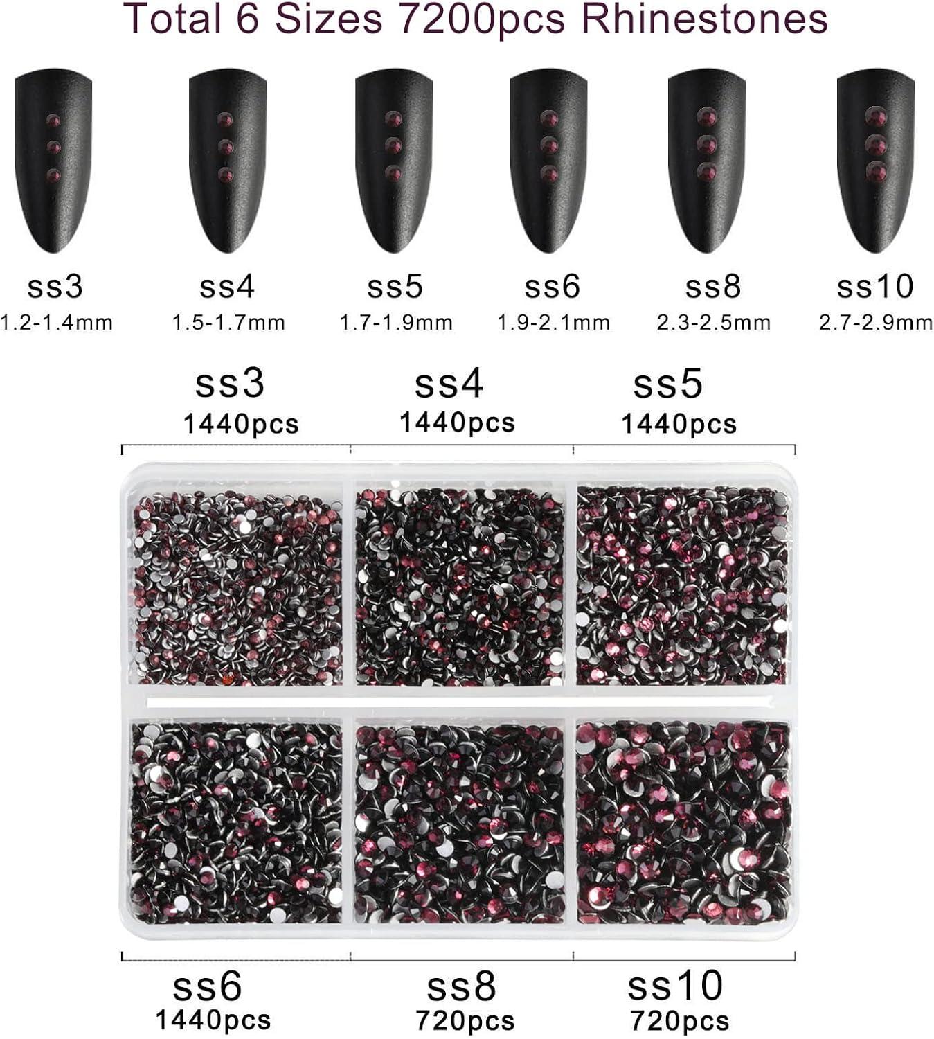 Large Quantity Nail Art Rhinestones Gems: SS3(1.2-1.4mm) 1440pcs,SS4(1.5-1.7mm) 1440pcs,SS5(1.7-1.8mm) 1440pcs,SS6(1.9-2.1mm) 1440pcs,SS8(2.3-2.5mm) 720pcs,SS10(2.7-2.9mm) 720pcs.Quantities may vary slightly.Color shades of different sizes may vary slightly.