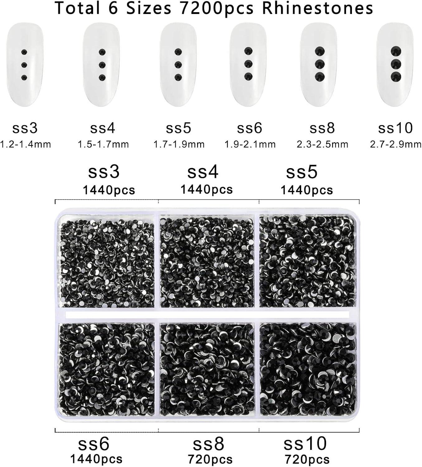 Large Quantity Nail Art Rhinestones Gems: SS3(1.2-1.4mm) 1440pcs,SS4(1.5-1.7mm) 1440pcs,SS5(1.7-1.8mm) 1440pcs,SS6(1.9-2.1mm) 1440pcs,SS8(2.3-2.5mm) 720pcs,SS10(2.7-2.9mm) 720pcs.Quantities may vary slightly.Color shades of different sizes may vary slightly.