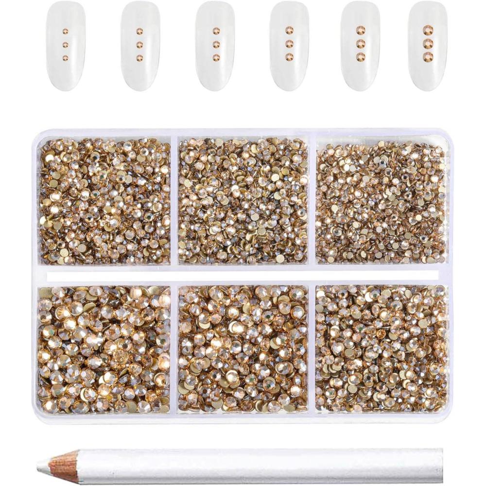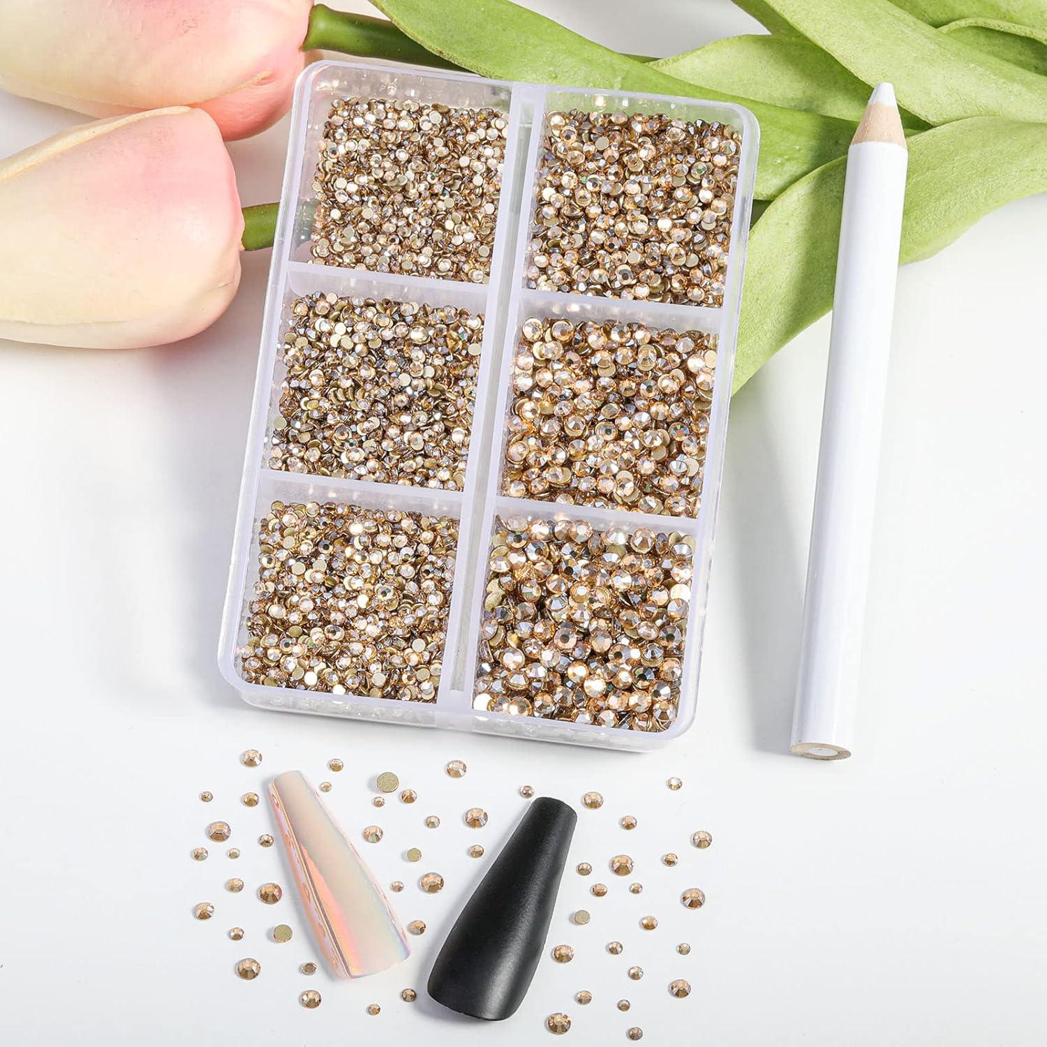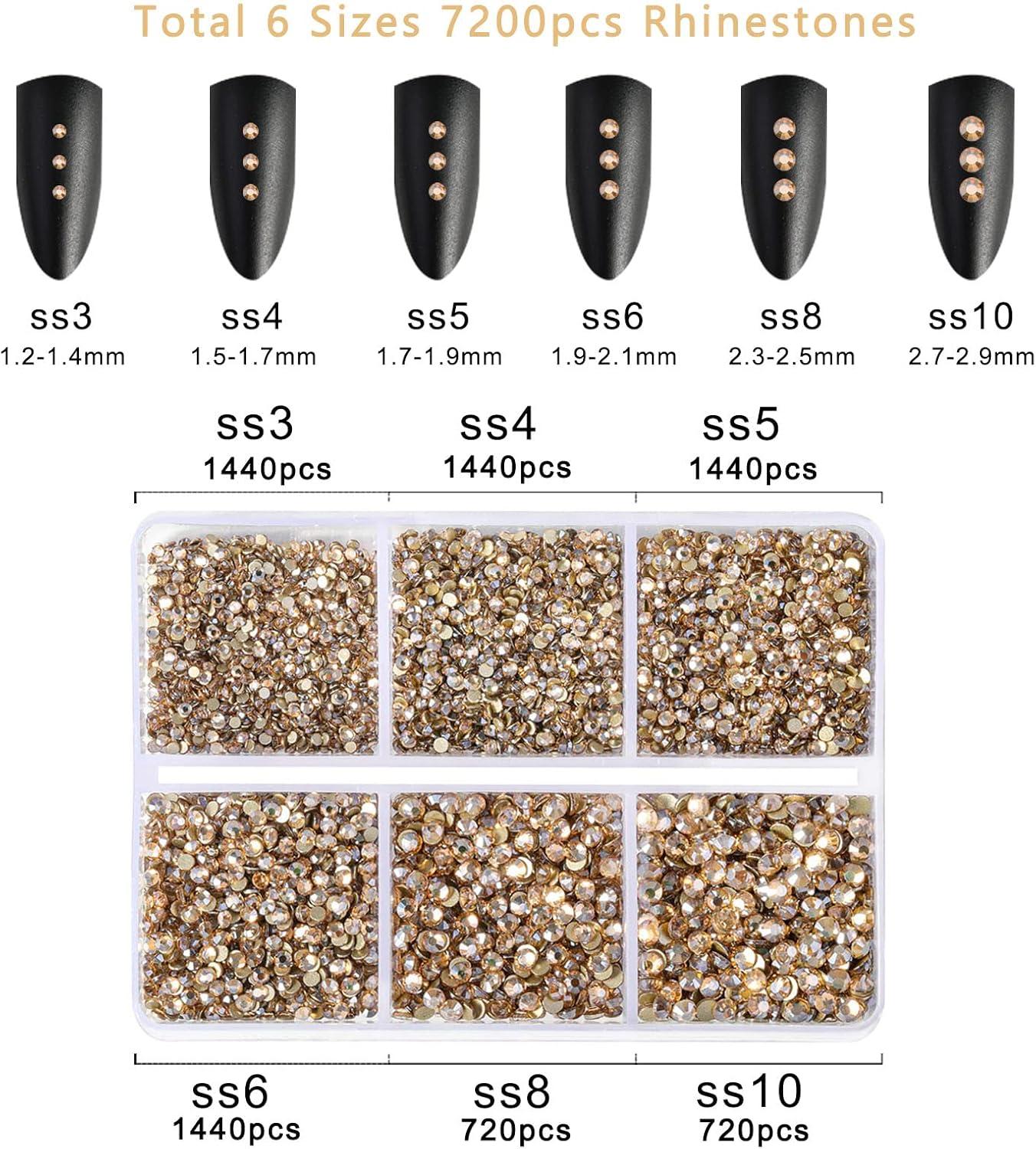 Large Quantity Nail Art Rhinestones Gems: SS3(1.2-1.4mm) 1440pcs,SS4(1.5-1.7mm) 1440pcs,SS5(1.7-1.8mm) 1440pcs,SS6(1.9-2.1mm) 1440pcs,SS8(2.3-2.5mm) 720pcs,SS10(2.7-2.9mm) 720pcs.Quantities may vary slightly.Color shades of different sizes may vary slightly.