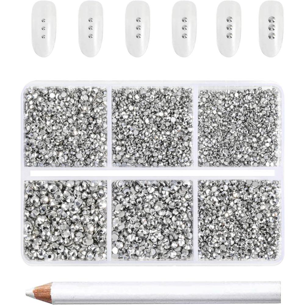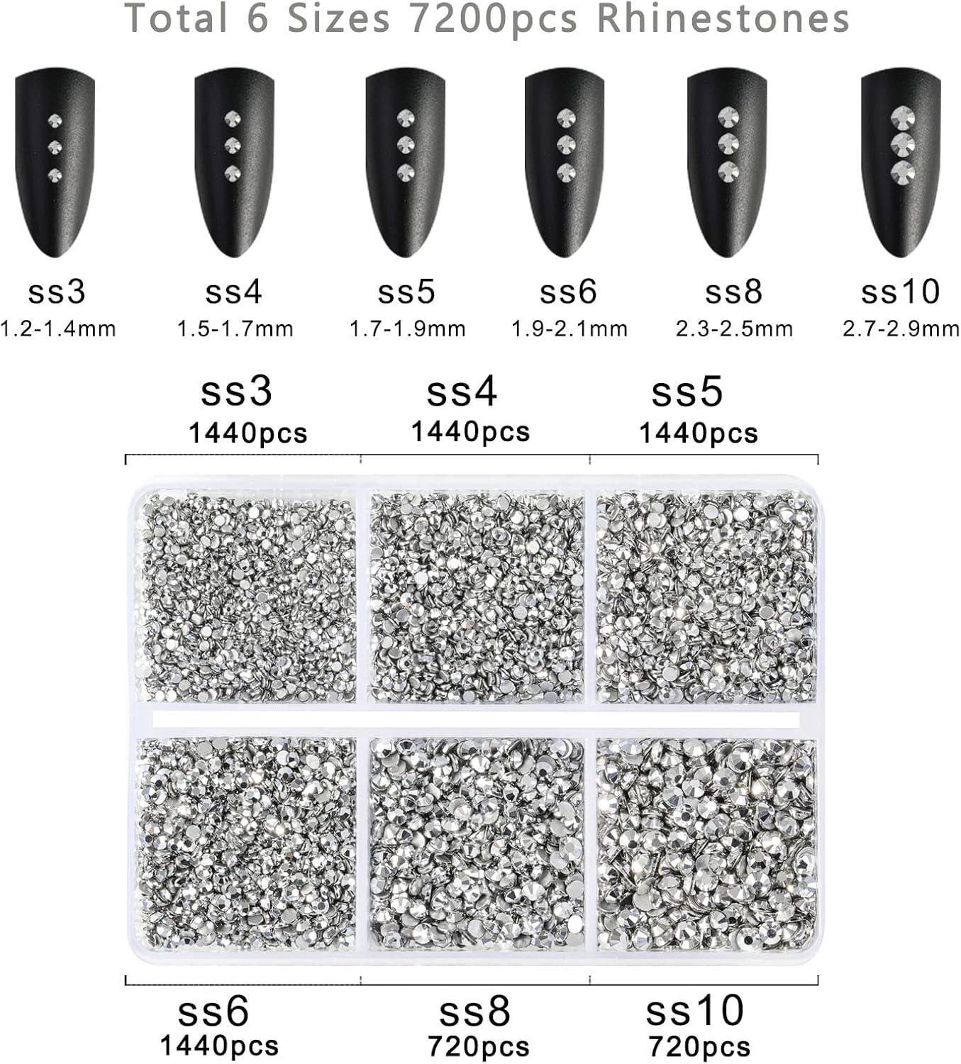 Large Quantity Nail Art Rhinestones Gems: SS3(1.2-1.4mm) 1440pcs,SS4(1.5-1.7mm) 1440pcs,SS5(1.7-1.8mm) 1440pcs,SS6(1.9-2.1mm) 1440pcs,SS8(2.3-2.5mm) 720pcs,SS10(2.7-2.9mm) 720pcs.Quantities may vary slightly.Color shades of different sizes may vary slightly.