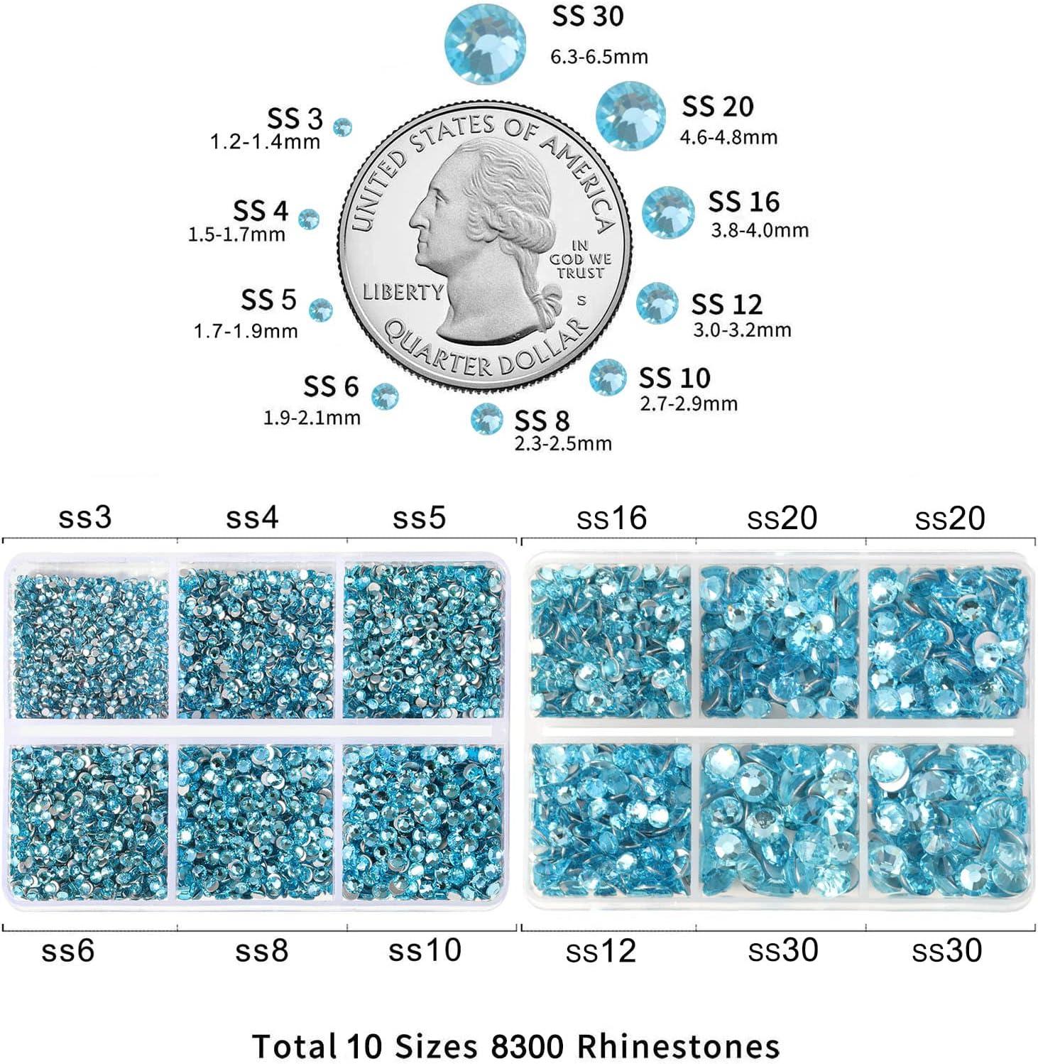 Pack of 2 box, total 8300 pieces crystal AB rhinestones for nails in 10 sizes,two wax pencils and one tweezer for glass rhinestones flatback.