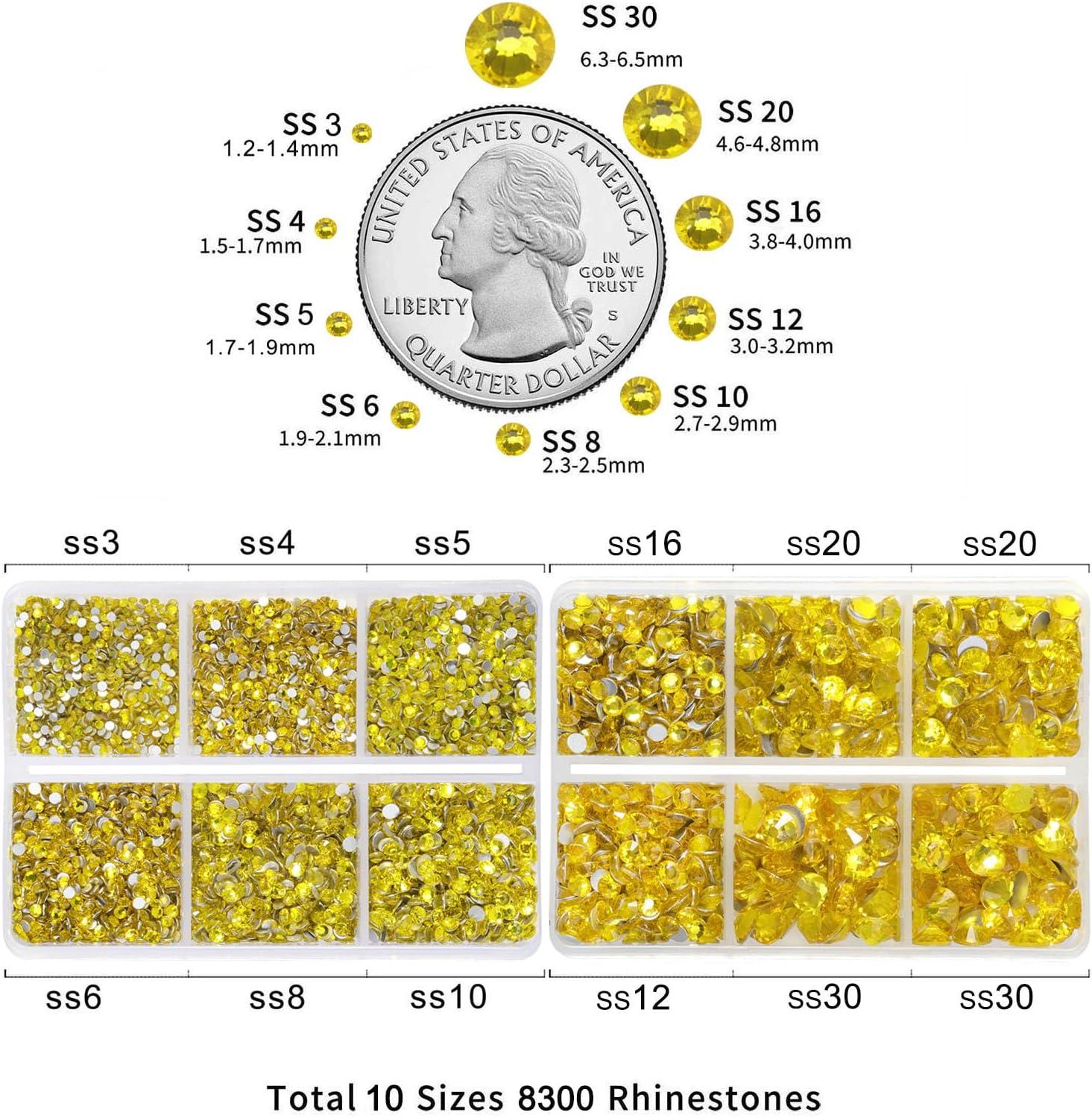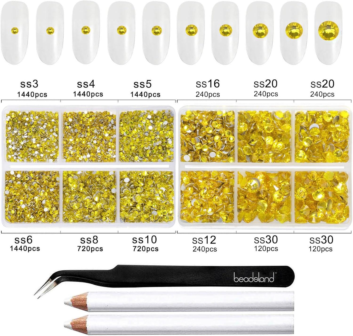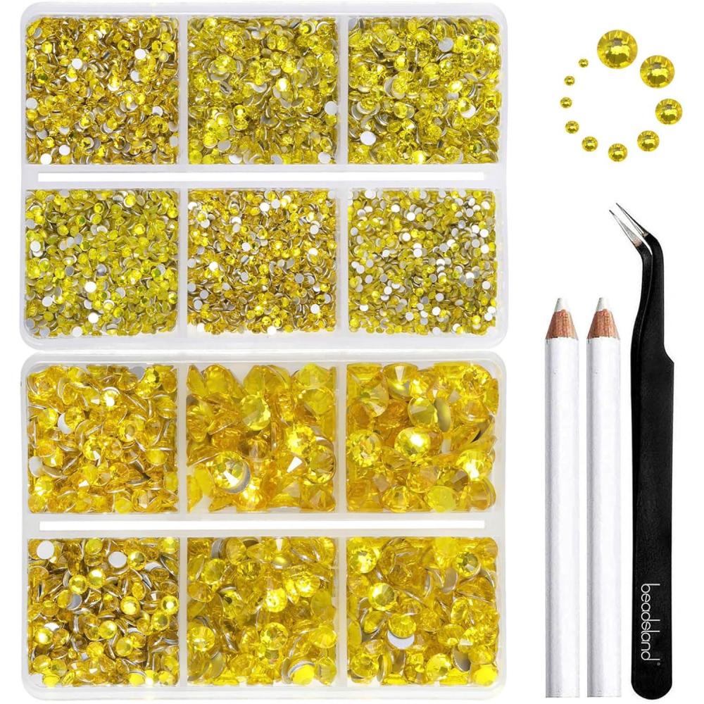 imageBeadsland 8300PCS Flatback Rhinestones AB Crystal Rhinestone Round Crystal Rhinestones for Crafts Mixed 10 Sizes with Wax Pencil and Tweezer Kit SS3SS30 Crystal ABLemon Yellow