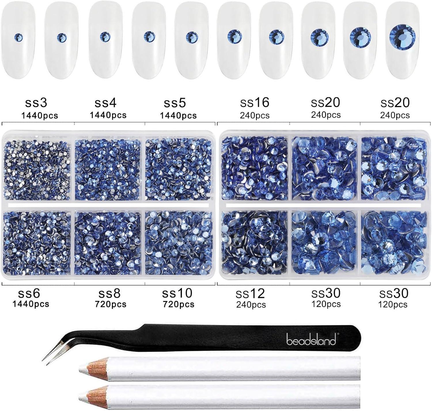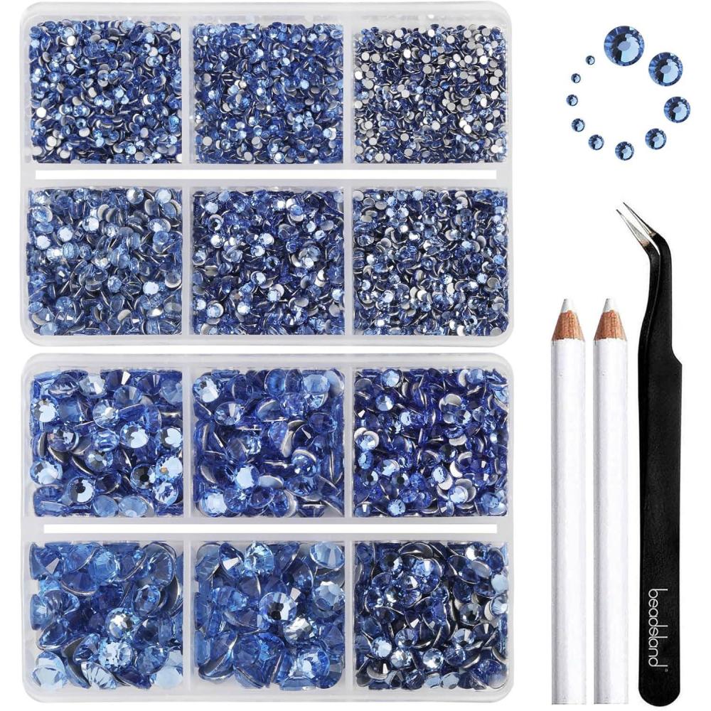 imageBeadsland 8300PCS Flatback Rhinestones AB Crystal Rhinestone Round Crystal Rhinestones for Crafts Mixed 10 Sizes with Wax Pencil and Tweezer Kit SS3SS30 Crystal ABLight Sapphire