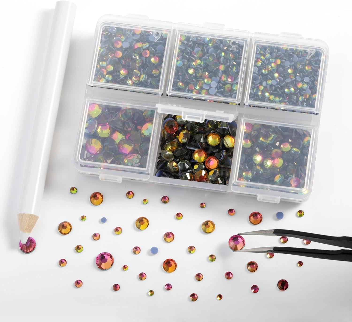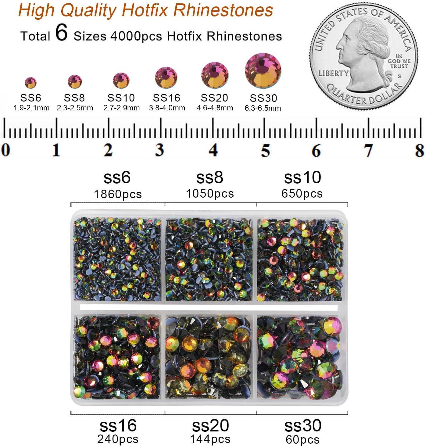 Package:Pack of 1 box, total 4000 pieces hot fix crystals rhinestones in 6 sizes,one wax pencils and one tweezers