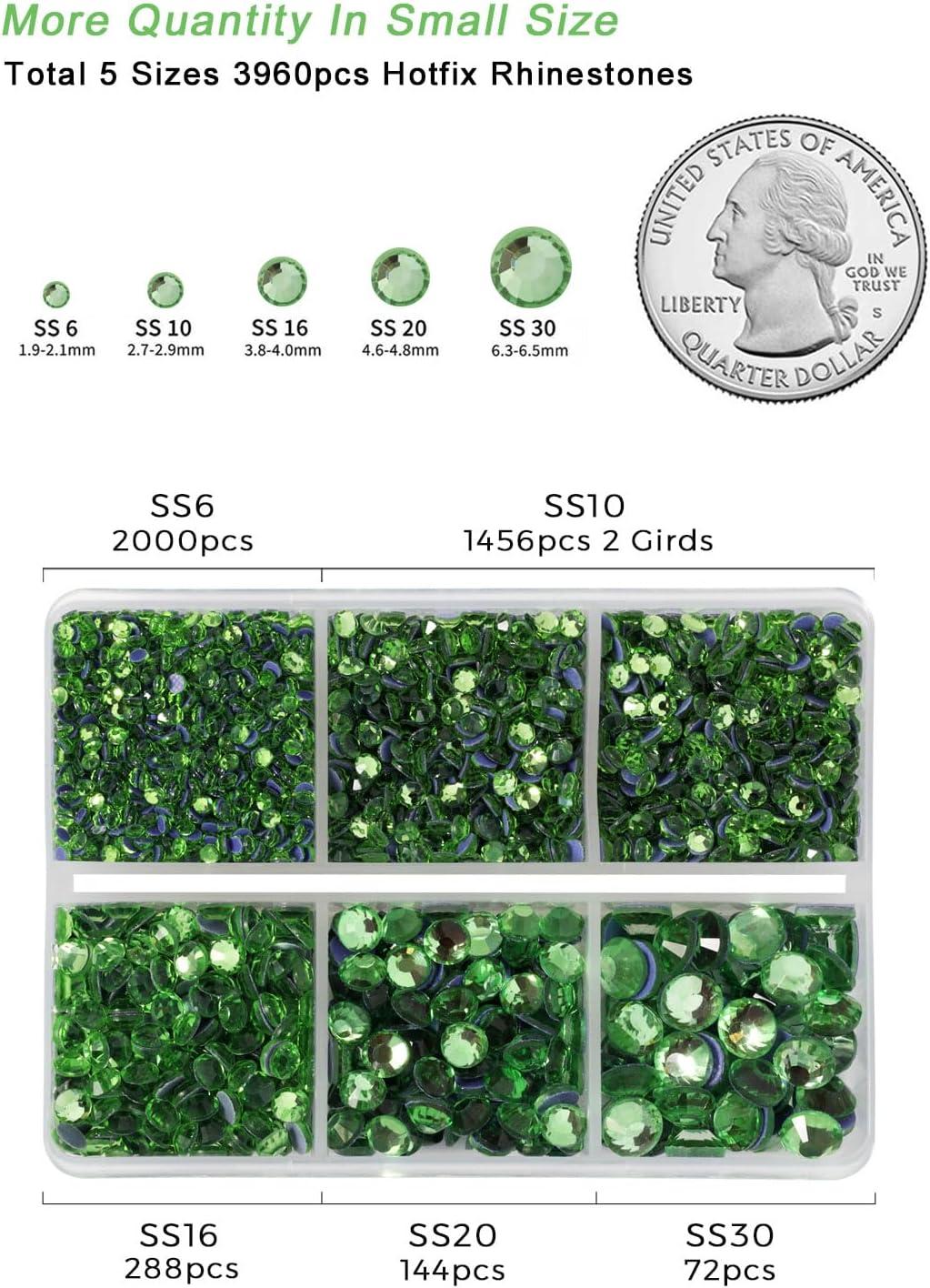 Hotfix Rhinestones 3960pcs, Red Rhinestone for Clothes, Hot Fix Crystals Rhinestones with Tweezers and Wax Pencil Kit,Mixed 5 Sizes, SS6-SS30, Siam(Light Green)