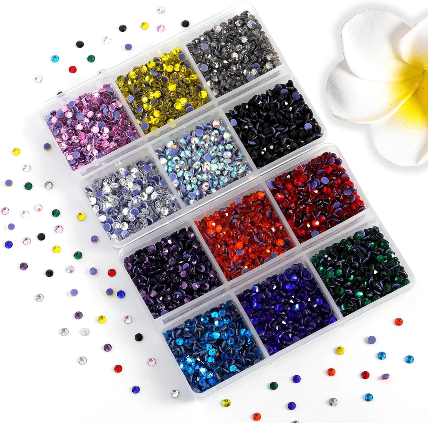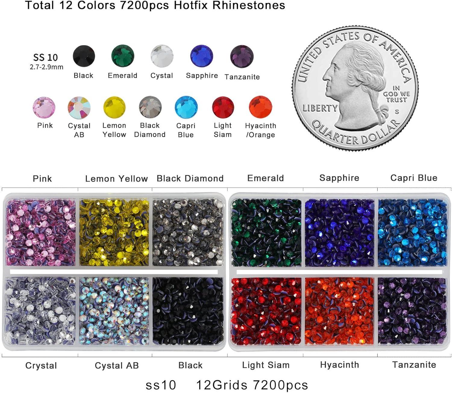 Hotfix Rhinestones Mixed 12 Colors, SS16 Rhinestones for Crafts Clothes, Hotfix Crystals with 1 Tweezers and 2 Wax Pencils(SS10/7200pcs)