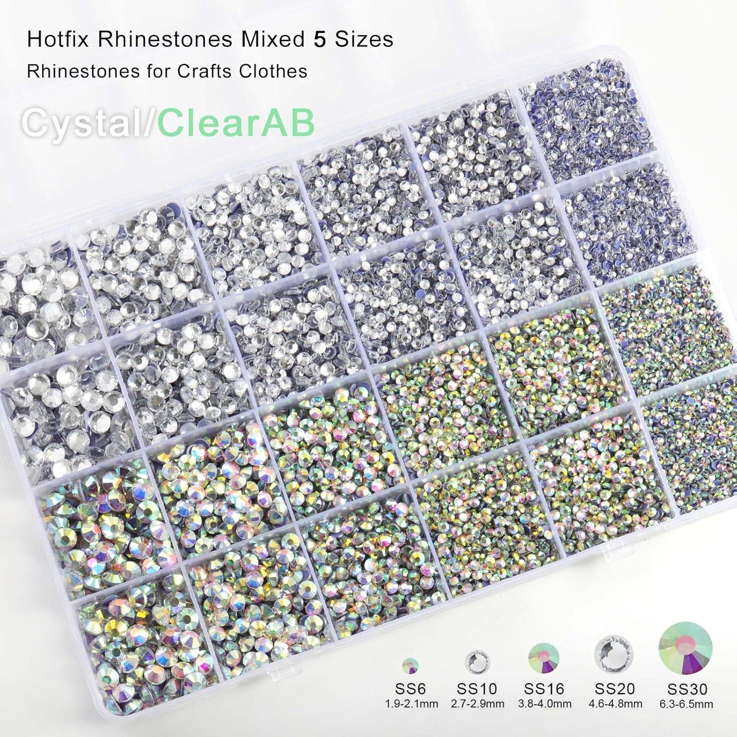 imageHotfix Rhinestones Multi Sizes Kit 14400 pcs Heat Fix Rhinestone for Bedazzling Clothes Crafts Mixed 5 Sizes with Wax Pencil Tweezers and Spoon SS6SS30 Clear AB and CrystalClear AB