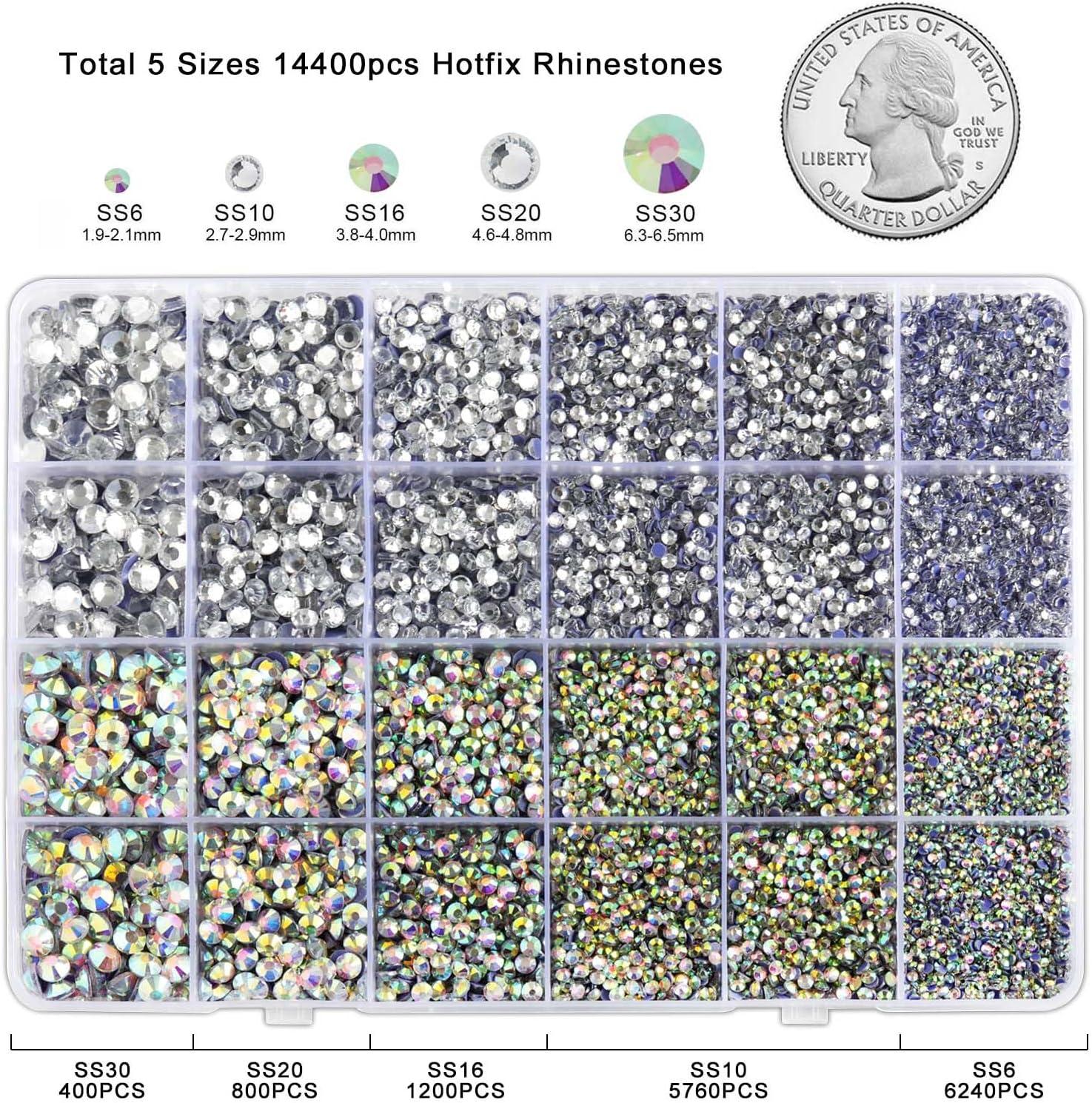 Hotfix Rhinestones Multi Sizes Kit, 14400 pcs Heat Fix Rhinestone for Bedazzling Clothes Crafts Mixed 5 Sizes with Wax Pencil, Tweezers and Spoon, SS6-SS30, Clear AB and Crystal(Clear AB)