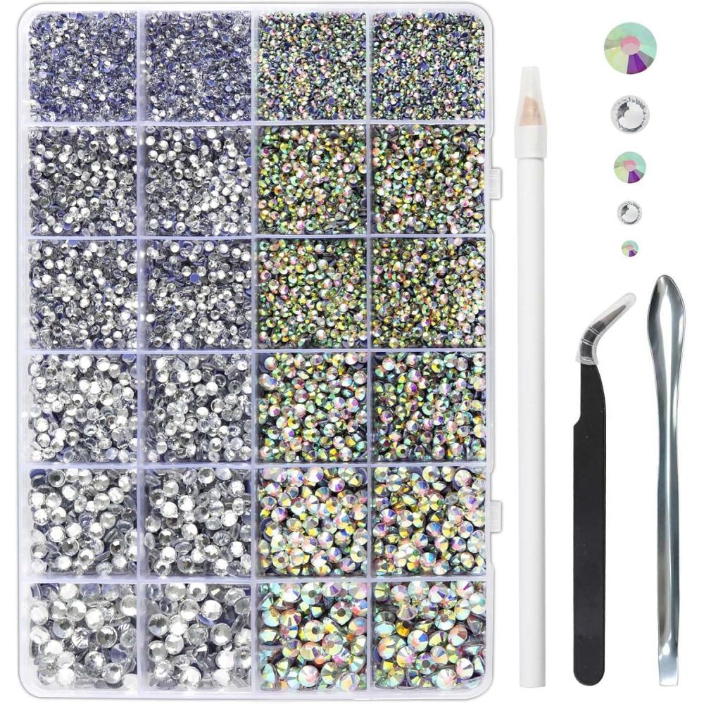 imageHotfix Rhinestones Multi Sizes Kit 14400 pcs Heat Fix Rhinestone for Bedazzling Clothes Crafts Mixed 5 Sizes with Wax Pencil Tweezers and Spoon SS6SS30 Clear AB and CrystalClear AB and Crystal